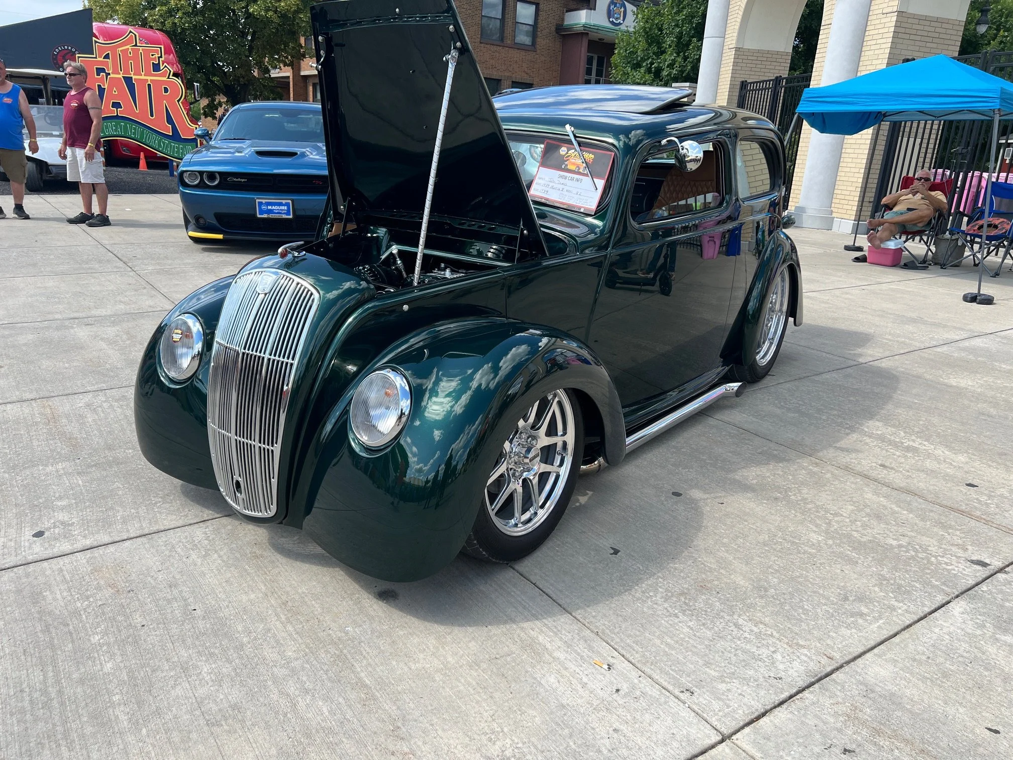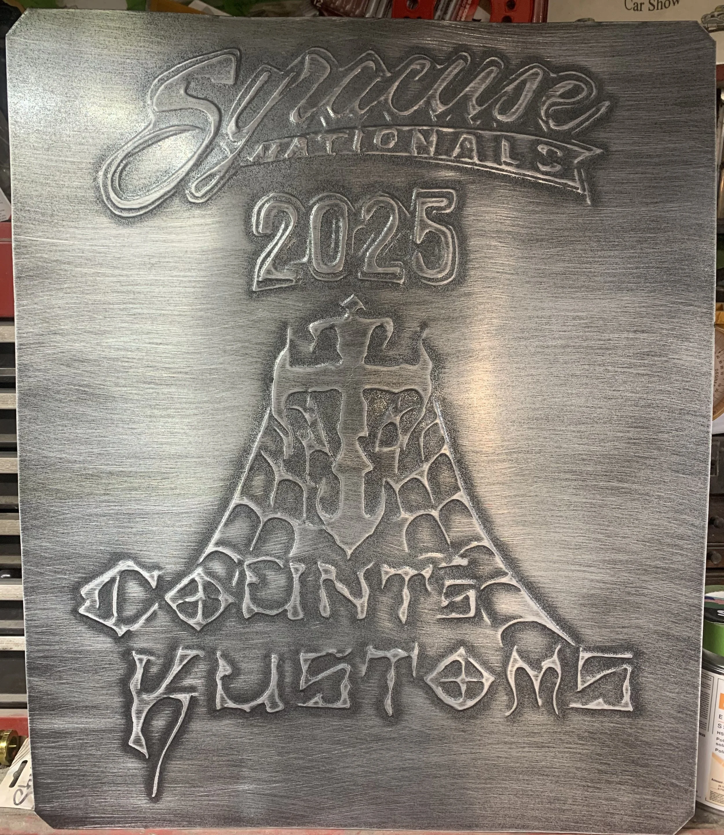 A custom bead rolled piece of artwork personally created by the Hobo’s Hot Rod Garage. Danny & the crew selected Kriss Barrick’s 1940 Ford as the 2025 award winner!